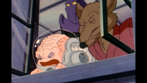 Но он вполне себе спокоен, осознавая сей факт, и с чувством выполненного долга забирает Крэнга, который по иронии оказывается у него в ногах и молит не оставлять его там, и с ним выпрыгивает в окно, спускаясь по трубе, а Бибоп и Рокстеди забавно усложняют этот спуск. )