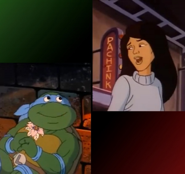 Правда ее встреча с лидером Черепашек Леонардо проходит неожиданно, они заинтересовались друг другом в бою и у них сразу же возникла романтическая симпатия. Но так как они были по разные стороны, договориться им не удаётся. Она оставляет Лео цветок лотоса и он все еще под впечатлением! К слову, она везде где "поработает" оставляла эти красивые цветы. Ее "визитная карточка".